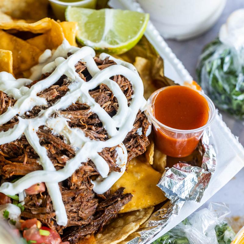 Con queso, birria, pico de gallo, cebolla, cilantro, sour cream, jalapenos, consome